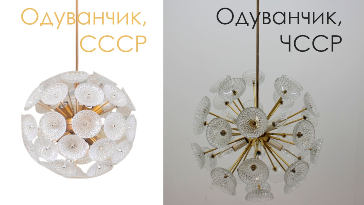 Как писали уважаемые эксперты, это не совсем наш дизайн. Все-таки первым в похожей стилистике сделали люстры в Италии, Германии и ЧССР. Судя по всему, наши производители заимствовали модель чешского производителя из Каменецки Шенова.