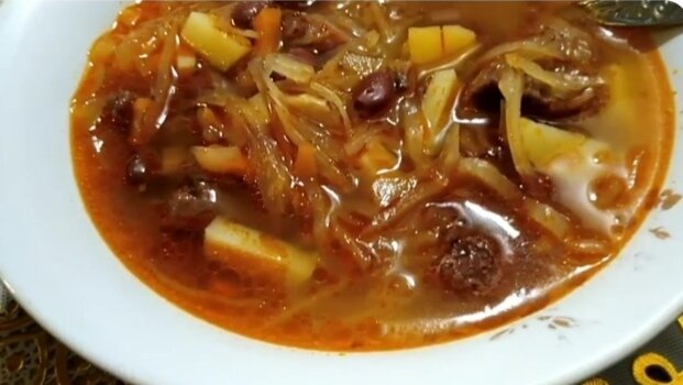 Готовлю очень вкусный, сытный борщ с квашеной капустой. Борщ варю на говядине. Бульон получается наваристый. А квашеная капуста придаёт кислинку. Рецепт: Мясо 300 гр Капуста 200 гр Картофель 3 шт Морковь 1 шт Лук 1 шт Томатная паста 1 столовая ложка Лавровый лист 2 шт Фасоль красная 1 банка В кастрюлю кладем мясо и заливаем водой. Всыпем 1 столовую ложку соли и ставим на газ. Вода закипела, снимем пенку, кладем капусту. Доводим до кипения, убавим газ и варим 1 час. Если мясо жесткое, то время варки увеличиваем. Приготовим поджарку: На растительном масле обжарим лук. Добавим морковь, жарим 10 минут на слабом огне. Кладем томатную пасту и жарим 5-10 минут. Поджарку кладем в кастрюлю с мясом и варим 30 минут. Достаем мясо. Положим картофель, фасоль, лавровый лист и варим 15 минут. Вкусный и сытный борщ готов!