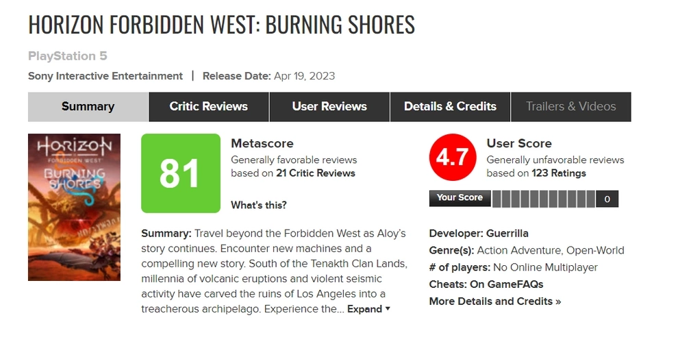 Игроки громят рейтинг Horizon Forbidden West: Burning Shores на Metacritic