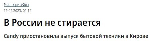 Судя по комментариям, у нас очень любят обсуждать остановку заводов в Европе. Но в то же время, в России крупные производители промышленной продукции с высокой добавленной стоимостью (например, бытовой техники), столкнулись с падением рентабельности до убыточных уровней, один крупный завод уже полностью остановил производство, другие могут остановить в ближайшее время. 17 апреля остановлен завод Candy (итальянский бренд, завод принадлежит китайской компании Haier) по производству стиральных машин и других предметов бытовой электроники в Кирове. По словам местного чиновника и представителей компании, остановка производства произошла в результате затоваривания, отсутствия спроса и повышения курса валют. Например, только из-за падения рубля компания, закупающая комплектующие за рубежом, потеряла 15% прибыли. Также российское производство не выдерживает конкуренции с импортируемыми из Китая аналогами. Заводы турецкой компании Arcelik в Липецке (выкупленные в 2022 году у американской компан