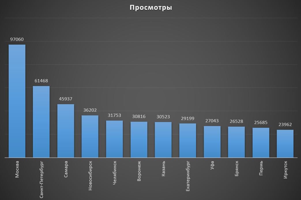 Обзор популярных событий на 23 апреля 2023г. по данным сайта Афиша7. ТОП-12 городов. ТОП-12 городов по количеству просмотров событий сайта https://afisha7.ru выглядит следующим образом: На этой неделе Воронеж потеснил в рейтинге Казань. Дальневосточный регион отметился 36 местом у Хабаровска, 43 местом у Владивостока и 60 местом у Южно-Сахалинска. Категории событий. В разрезе категорий событий качественных изменений не зафиксировано: первое место за категорией «Кино», второе место занимает «Театр», категория «Выставки» замыкает пятерку лидеров после «Концертов» и «Встреч». Перед майскими праздниками наблюдаем ожидаемый рост просмотров. Тройка лидеров выглядит так: «Театр» - 133%, «Концерты» - 125%, «Кино» - 124%. Средний прирос составил 107%, минимальное значение прироста просмотров у «Обучение» - 84%. ТОП-10 событий Десятка лидеров событий по количеству просмотров представлена на следующей диаграмме: В ТОПе все события категории «Кино». Абсолютный лидер «Чебурашка». Отечественный филь