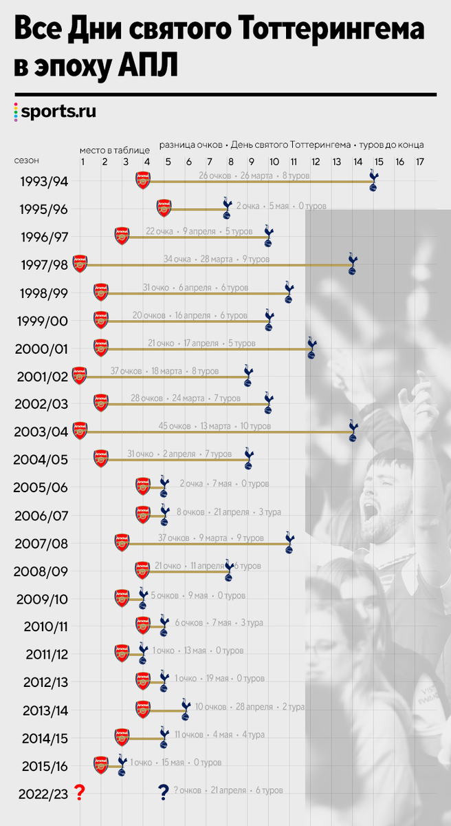 Не отмечали с 2016-го. В пятницу «Арсенал» не дожал идущий на 20-м месте «Саутгемптон» и усложнил чемпионскую гонку. Но даже такой невеселый вечер принес чуть-чуть радости. Пускай и очень локальной. Разрыв между «Арсеналом» и «Тоттенхэмом» разросся до 22 очков: а значит, команда Артеты впервые с 2016-го празднует День святого Тоттерингема – шутливый праздник, в который «Тоттенхэм» лишается математических шансов опередить принципиального соперника в таблице. Впервые подначить соседей по северному Лондону предложили на одном из фанатских форумов «Арсенала» в начале 2000-х. Арсен Венгер и компания год за годом боролись за чемпионство, а «Тоттенхэм» привык барахтаться в середине на отметке 45-50 очков за сезон. Название праздника сложилось из имени клуба и английского глагола «tottering» – «шататься», что отлично описывало состояние «шпор» в начале века. Идею довольно быстро подхватили в медиа, и уже в 2010-е о финише выше соседей стали спрашивать у игроков и тренеров. В 2012-м в ловушку п