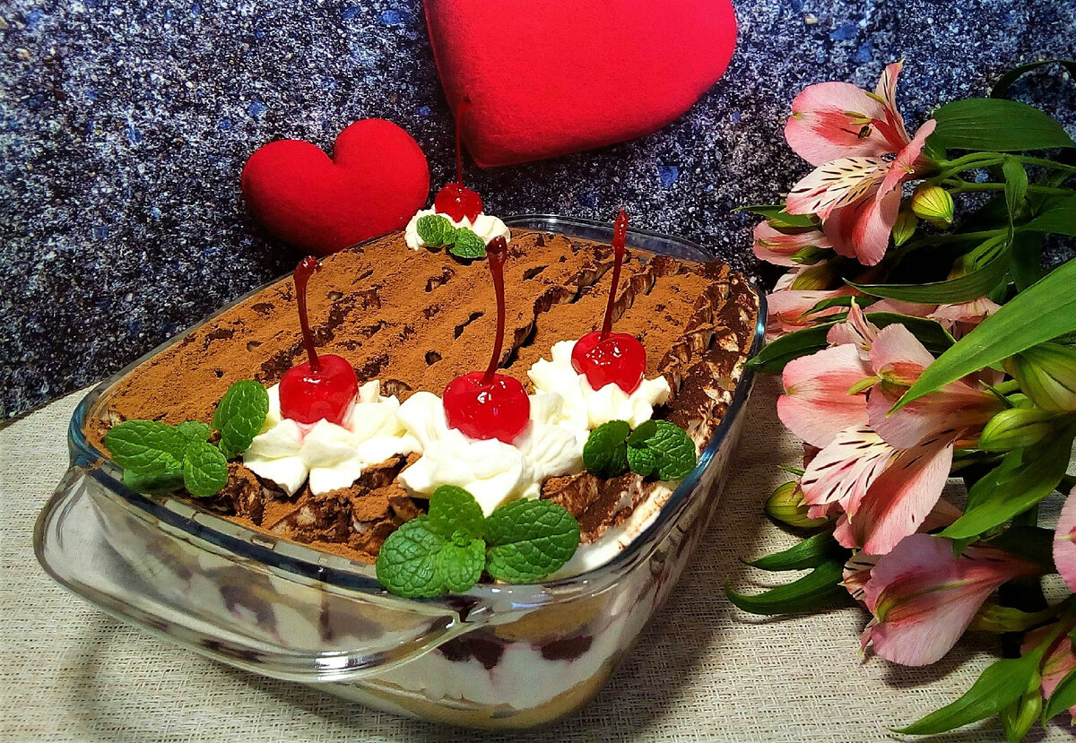 Тирамису готовила с разными фруктами и ягодами. Сегодня решила попробовать с замороженной вишней без косточек. Савоярди взяла с шоколадом. Очень вкусно получилось.