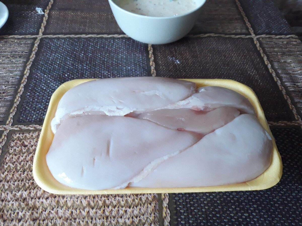 Жареные на сковороде отбивные тоже имеют право быть на нашем столе, но только по выходным, когда приходят гости. Я никогда не агитирую за правильное питание больше, чем нужно для поддержания беседы. Каждый человек решает сам, как ему жить и чем питаться. И гости ко мне приходят точно не за тем, чтобы узнать очередной ПП рецепт). Как пожарить вкусные отбивные из куриного филе в кляре Причём на слове "вкусные" в этом рецепте я настаиваю). 1. Готовим куриное филе Заранее размораживаем куриную грудку (в подложке на фото около 700 граммов). Затем нарезаем каждую грудку сначала вертикально на порционные куски желаемого размера (для внуков я делю на более мелкие куски), затем прижимаем каждый кусок левой ладонью, а правой рукой режем ножом вдоль. Получаются примерно такие порции. Затем эти куски я немного отбиваю молоточком с обеих сторон: Солю, посыпаю специями для курицы и складываю в тарелку. 2. Готовим кляр В чашку с высокими краями наливаю 1 стакан молока, разбиваю 1 яйцо, добавляю 1 ст.