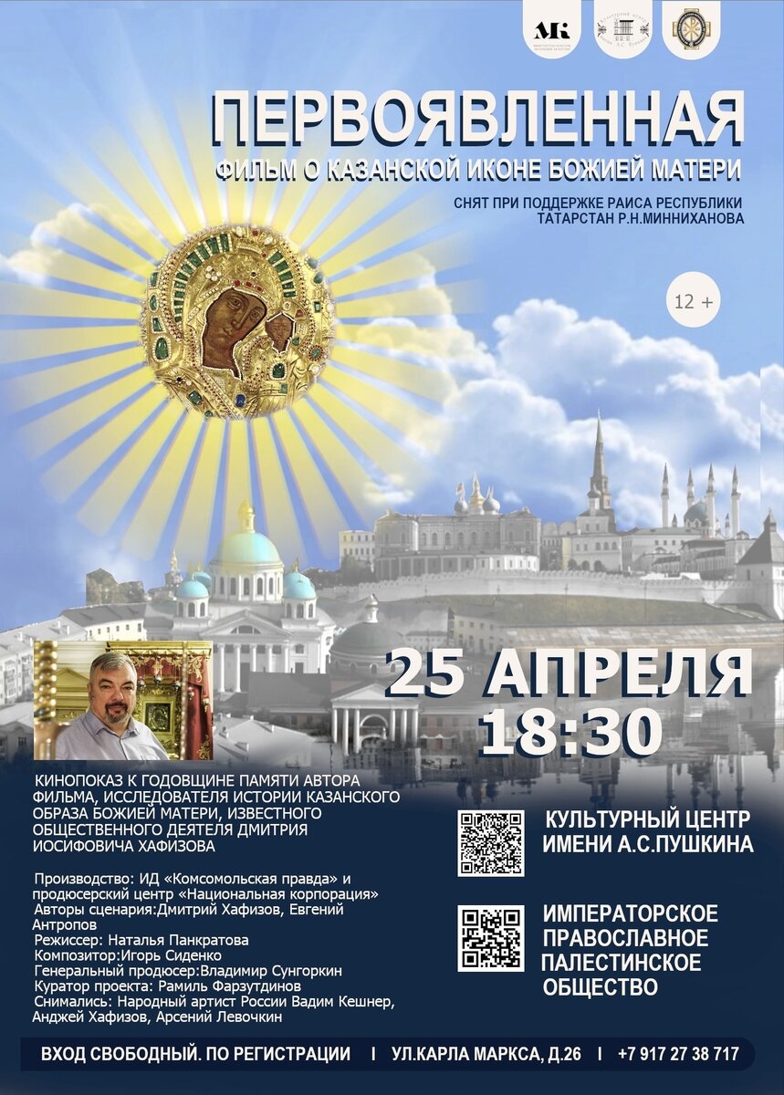 Приглашаем на показ документального фильма "Первоявленная" о Казанской иконе Божией Матери, снятого Издательским домом «Комсомольская правда» и Продюсерским центром «Национальная корпорация» при поддержке Раиса Республики Татарстан Р. Н. Минниханова. Кинопоказ приурочен ко второй годовщине памяти автора фильма, советника мэра г. Казани, члена Общественной Палаты Республики Татарстан, Президента Федерации игры ГО в Республике Татарстан, известного историка, журналиста, сценариста, кинопродюсера и общественного деятеля, эксперта по истории Казанского образа Божией Матери, Председателя Татарстанского регионального отделения Императорского Православного Палестинского Общества Хафизова Дмитрия Иосифовича. А вы знали, что Казанская Икона Божией Матери была чудесным образом обретена на пожарище в Казани еще в XVI веке? И со временем стала самой почитаемой российской святыней, а также домовой иконой царской династии Романовых. С ее покровительством связано изгнание польских интервентов дружин