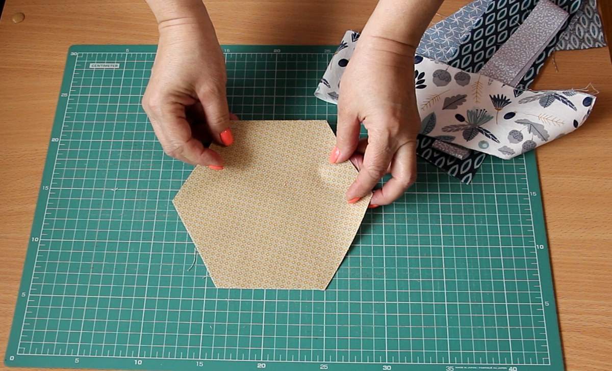 Для пошива этой салфетки я выкроила 1 шестиугольник: и шесть половинок шестиугольника: Далее взяла полосу ткани и пришила с длинным сторонам половинок шестиугольников: А дальше собираем нашу салфетку из кусочков и пришиваем по очереди их: И остается собрать сендвич, простегать, окантовать и наша салфетка готова: Подробный МК по пошиву этой салфетки тут: Салфеточку шила в дополнение к панно и двум подушечкам. Помоему получилось очень симпатично: