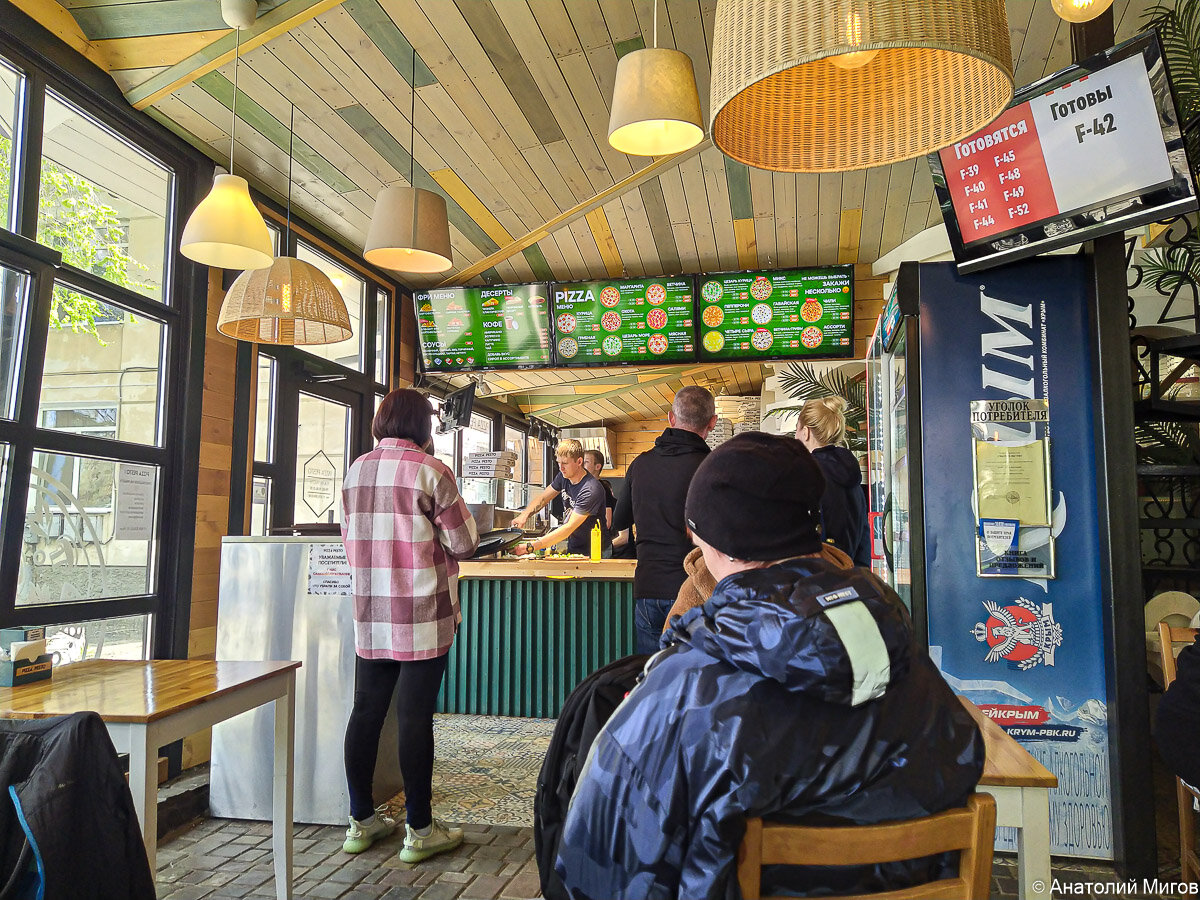Очень захотелось пиццы. Сели в машину и махнули в Феодосию. Вот минус маленького городка: за пиццей или за японской едой надо ехать в соседний город. Нет, несколько раз мне попадались объявления, что и в нашем Старом Крыму готовят пиццу. А однажды мы с Леной ели суши-роллы в местном кафе. Но не оценили, так себе была еда. Так что, как только в Феодосии появились СушиВок, так мы стали туда ездить. А там в нескольких шагах пиццерия с очень вкусной пиццей. "Поехать в соседний город" - звучит серьёзно, как настоящее путешествие. На самом деле от ворот нашего дома до пиццерии всего 25 км. Для кого-то расстояние. А я, когда мы жили в Москве, каждый день ездил на работу - 33 км в одну строну. И считал себя счастливчиком, потому маршрут был по МКАД, и я доезжал до работы всего за 30-40 минут. А в Питере до офиса было 27 км, но через город, так что случалось и по полтора часа добираться. Ну а 25 км по свободной старой феодосийской дороге - это вообще ни о чём, полчаса и мы на месте. Удивило