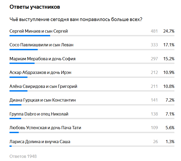 У сегодняшнего трио получилось очень душевно (вариант Осина). И папа органично встроился. От меня им сегодня сердечко. И судьям всё понравилось. Все пятёрки.