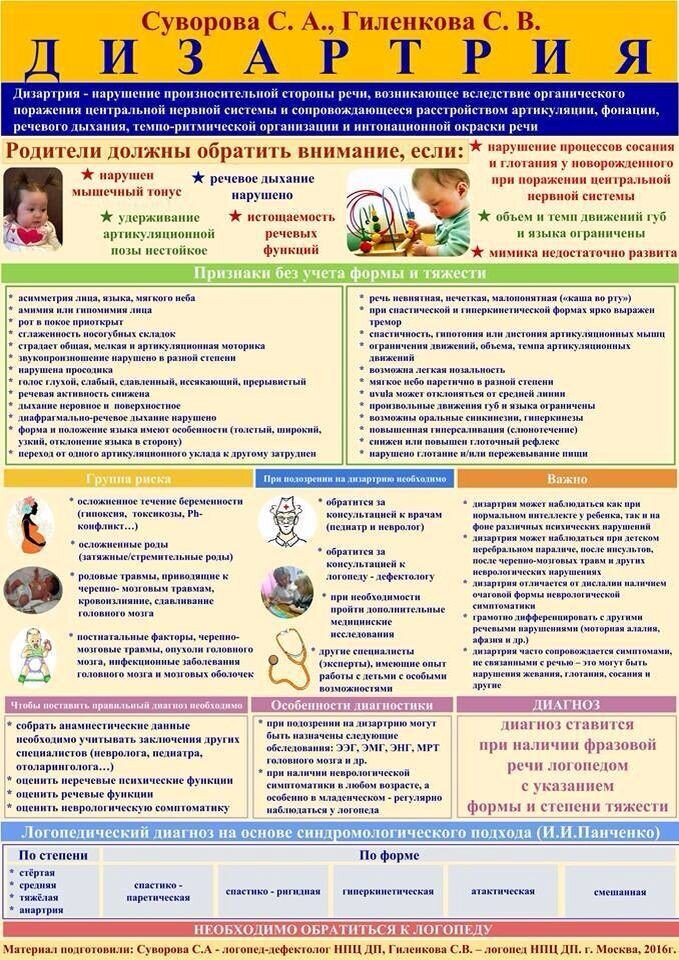 При дизартрии нужен не только логопед, но и невролог, потому что её причины лежат в области неврологии. Проявляется она обычно не только в речи, но и других неречевых видах деятельности. Например, частым симптомом является подтекание слюны у ребёнка. Дизартрия усложняет логопедическую работу тем, что звуки дольше автоматизируются и труднее входят в речь ребенка.