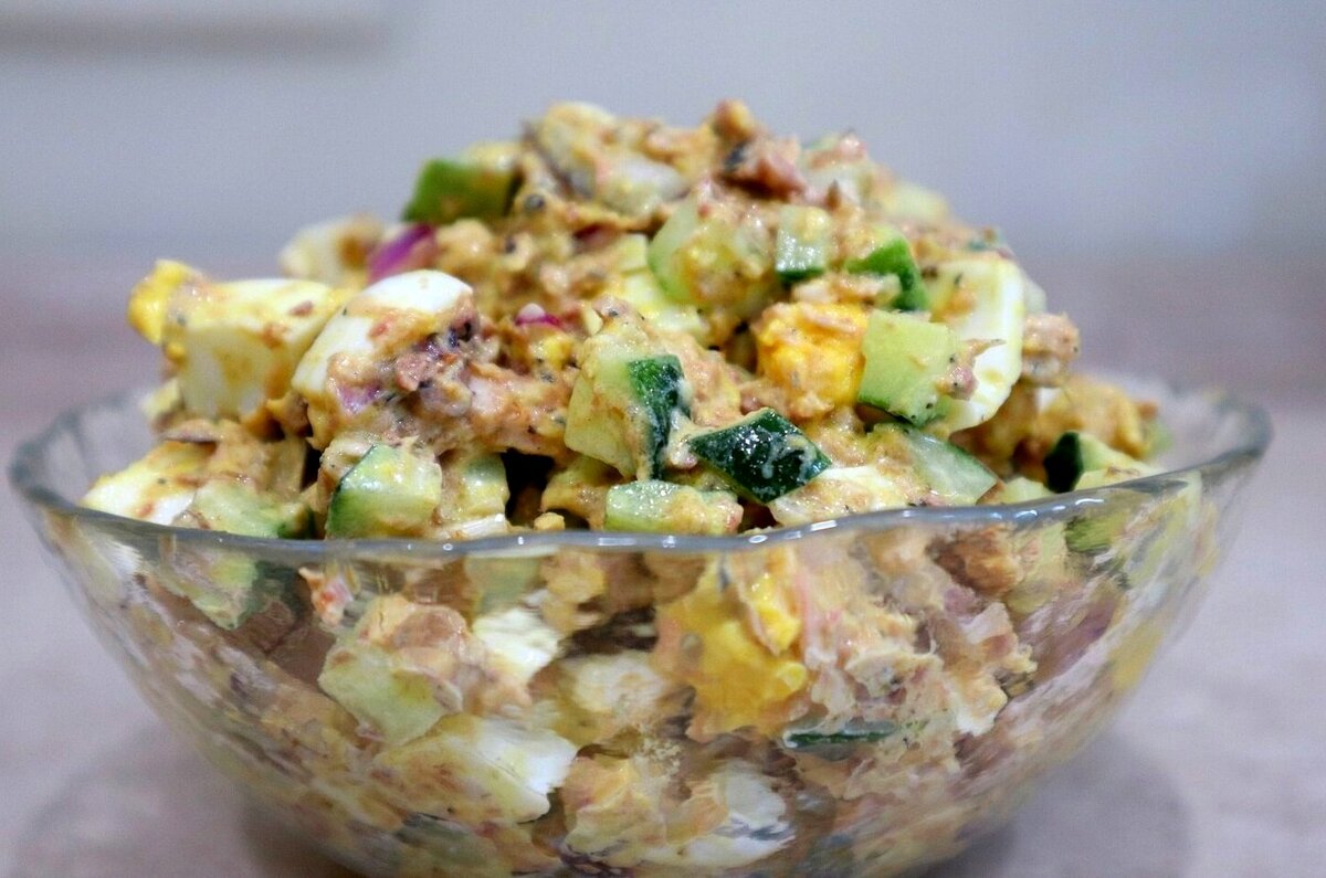 Быстрый и вкусный салат, который можно приготовить буквально за несколько минут. Он очень простой, но при этом оригинальный, редко где встречаю этот рецепт. Салат можно и семье к ужину приготовить, и на стол гостям подать. Кстати, именно для этого салата у меня всегда в холодильнике стоит баночка рыбных консервов. Очень выручает, когда неожиданно нагрянут гости. Начнем готовить: Самое долгое в этом салате - это сварить яйца. Поэтому если у вас уже есть вареные, то на приготовление этого салатика вы потратите не более 5 минут. Отлично подходит, сайра, тунец, скумбрия и вообще любая другая рыбка. Косточки удаляем, филе разминаем вилкой. Теперь: Яйца нарезаем кубиком, добавляем рыбу, и затем свежий огурец. Вот, собственно, и все основные ингредиенты. Можно разнообразить вкус салата и добавить еще лук, советую взять красный, салатный - он сладкий, его вкус идеально сюда подходит. Но повторяюсь: салат хорош и без него. Ну и остается только немного подсолить салат и заправить его майонезом.