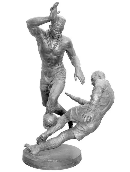 Речь сегодня пойдет не о настоящих футболистах, но о тех, изображение которых известно всем в нашей стране, даже не любителям футбола. Вот они: Да, это скульптура "Футболисты", копии которой разошлись по многим городам бывшего СССР, миниатюра (не копия) которой венчала трофей чемпионата СССР, а теперь - кубок, который вручается чемпиону России. Автор "Футболистов" - скульптор Иосиф Чайков. Создал он их в 1928 году (95 лет юношам в этом году!). Гипсовая модель под патину была всего 83 сантиметров. С гипсового оригинала скульптуры Чайкова была сделана бронзовая отливка в том же 1928 году, сейчас она находится в музее Смоленска. На скульптуре двое - нападающий и вратарь, упавший ему в ноги. Вероятно не без нарушения правил. Раньше ведь вратари падали в ноги форвардам руками вперед, а здесь явно голеадор обманул голкипера. Мяч уже фактически за фигурой вратаря, то есть путь к воротам открыт. Будет гол! После показа на III выставке скульптуры Общества русских скульпторов в 1929 году о скул