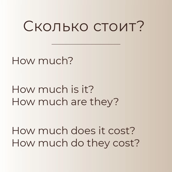 ☑️Способ 1 Дословный перевод - Как много? Имеется ввиду как много денег, но слово "деньги" опускается, т.к. все понимают, что расплачиваемся именно деньгами. ☑️Способ 2 Этот вариант подходит, если вы покупаете что-то в единственном числе, например футбоку или кепку, а также что-то неисчисляемое, например, воду или крем. Этот вариант подойдет для покупки чего-то во множественном числе, например яблок 🍏🍎или персиков🍑🍑. Многие предметы одежды также всегда во множественном числе, например джинсы, шорты (джинсы = они). ☑️Способ 3 Слово "cost" означает "стоит", это смысловой глагол. Do и does - вспомогательные глаголы, они помогают смысловому глаголу, но не имеют перевода.