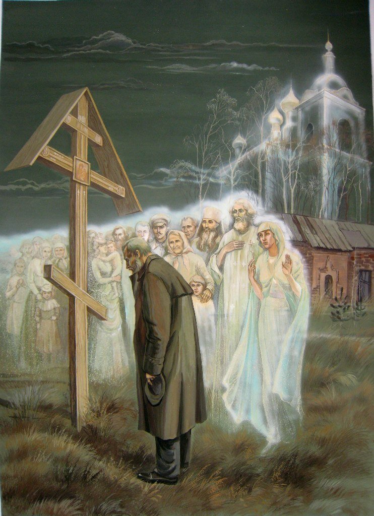 Я стал наблюдать за общей группой молящихся, которая как бы смешалась с дрожащими в светлых лучах призраками из потустороннего мира, и увидел еще более чудную картину. В то время, когда произносились слова “Благословен еси, Господи, научи мя оправданием Твоим” или слова “Сам, Господи, упокой души усопших раб Твоих”, видно было, как лица живых озарялись одинаковым светом с лицами отошедших, как сердца сливались в одно общее сердце, как слезы не уныния, а радости текли из глаз тех, кто носил телесную оболочку, и в то же время какой горячей любовью, беспредельной преданностью горели глаза помянутых.