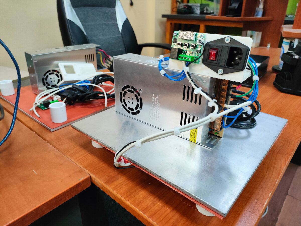 "вакуумирования" на 4 бара. Или для более быстрого затвердевания остатков материла на лопатках и внутри шприцов. Собственно, просто выкачать воздух мало, надо и хорошенько запечь "пирожок"... Для этого было закуплено некоторое количество комплектующих, из которых и создавался гений инженерной мысли. Конструкция достаточно проста и являет собой некую часть от привычных всем 3д-принтеров. Есть силиконовый коврик с алюминиевой платформой, подключенной через плату управления к блоку питания. Но, как показала практика, всё это блажь... Не рассчитана эта электроника на такие токи. Не помогает и о