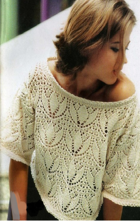 1. Первая модель этой подборки - кофточка с ажурным узором. Крупные цветочные мотивы напоминают распустившиеся тюльпаны. Простой круглый вырез горловины, прямые короткие рукава, светлая пряжа - модель хороша на весну. 2. Очень простая туника без рукавов с вертикальным ажурным узором. Пояс, продернутый по линии талии удобен и улучшает посадку модели на фигуре. Выкройка - два простых прямоугольника. 3. Сетчатый кардиган цвета хаки. Удобная выкройка с рукавами "летучая мышь", свободные проймы. Кардиган без застежки, простой и выразительный за счет цвета. 4. Розовый джемпер с диагональным узором. Диагональные ажурные полосы узора расходятся от центра джемпера. Смотрятся свежо и оригинально. 5. Жилет. С воротником-шалькой. Классический серый цвет, простая эластичная резинка два на два. Широкая поперечная деталь подчеркивает линию талии. Из декоративных отделок - скромная завязка на шнур из той же пряжи, что и сам жилет. 6. Весенний пуловер универсального бежевого цвета, который сочета