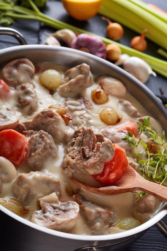 Тушеное мясо с грибами и помидорами в сливочном соусе.