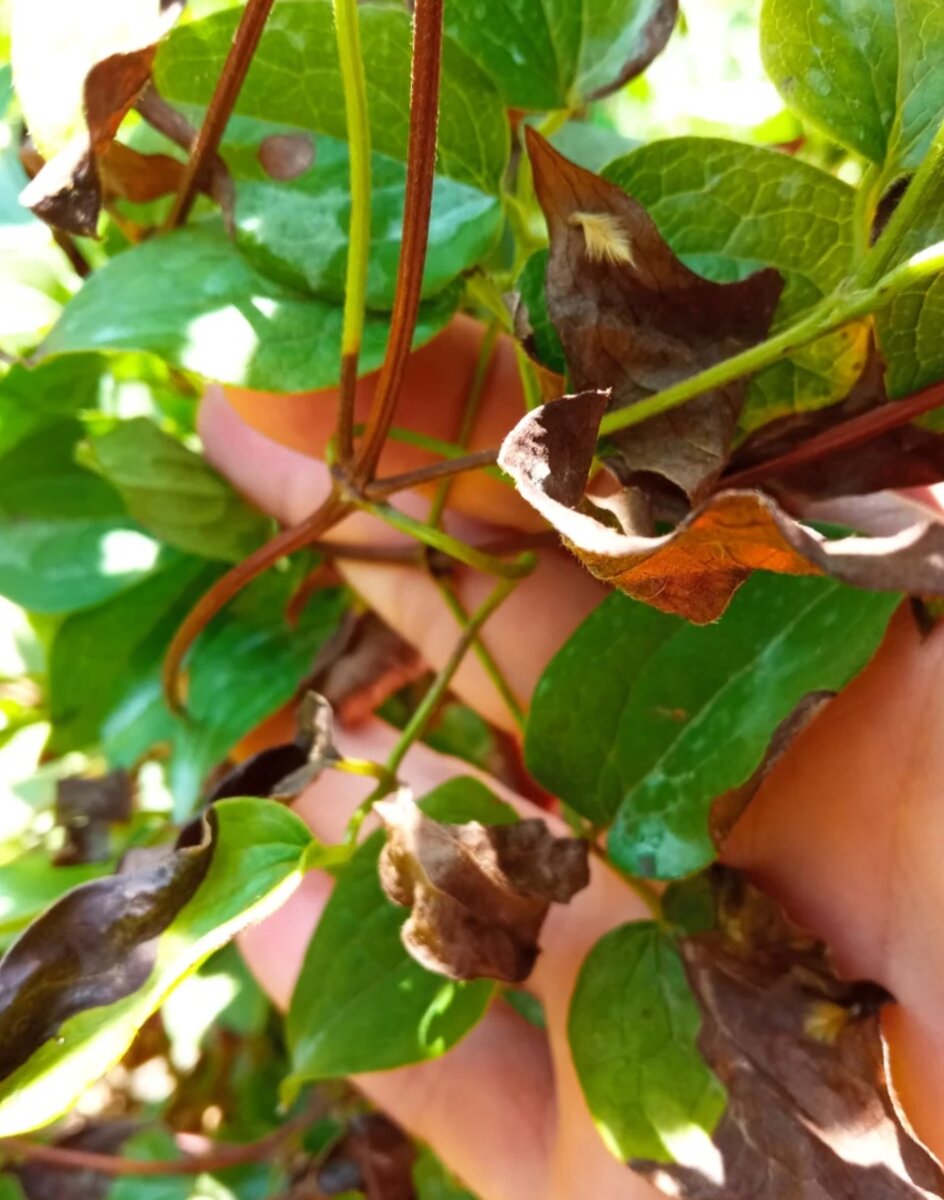 Самое главное - избежать этой болезни. Борьба с вилтом сомнительна. Правда мне удавалось около четырёх лет поддерживать один заболевший, а ещё один жив по сей день. Он даже проснулся в этом году как ни в чем не бывало. Но его жизнь под большим вопросом. Что такое вилт, если кто не в курсе. Это заболевание вызывает гриб фузариум, известный своей зловредностью и устойчивостью. Поначалу болезнь не видно, гриб живёт в земле. Он проникает в корни клематиса, разрастается там. Гриб состоит из тонких ниточек - гифов, и в какой то момент эти гифы забивают полностью сосуды растения. По ним перестаёт поступать вода. Внешне это проявляется в том, что побег начинает вянуть без всяких признаков повреждения. Как будто его отломили. Вянет сначала верх. Потом весь побег. И в конце побег чернеет и резко выделяется в зелёной массе куста. Прошу заметить, что отломаные побеги не чернеют. Они засыхают зелёными. В этом отличие. После одного, начинают чернеть другие, и в итоге все. Если ничего не делать
