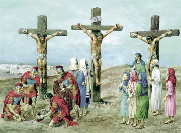 “И, неся крест Свой, Он вышел на место, называемое Лобное, по-еврейски — Голгофа. Там распяли Его и с Ним двух других, по ту и по другую сторону, а посередине — Иисуса. Пилат же написал и надпись и поставил на кресте. Написано было: «Иисус Назорей, Царь иудейский». Эту надпись читали многие из иудеев, потому что место, где был распят Иисус, было недалеко от города, и написано было по-еврейски, по-гречески, по-римски. Первосвященники же иудейские сказали Пилату: «Не пиши: "Царь иудейский", но что Он говорил: "Я — Царь иудейский"». Пилат отвечал им: «Что я написал, то написал». Воины же, когда распяли Иисуса, взяли одежды Его и разделили на четыре части, каждому воину по части, и хитон. Хитон же был не сшитый, а весь тканый сверху. Итак, сказали друг другу: «Не станем раздирать его, а бросим о нём жребий, чей будет». Да сбудется речённое в Писании: «Разделили ризы Мои между собой и об одежде Моей бросали жребий». Так поступили воины. При кресте Иисуса стояли мать Его, и сестра матери Его, Мария Клеопова, и Мария Магдалина. Иисус, увидев мать и ученика, тут стоящего, которого любил, говорит матери Своей: «Женщина! Вот сын твой». Потом говорит ученику: «Вот мать твоя!» И с того времени ученик этот взял её к себе” (Ин. 19:17–27).