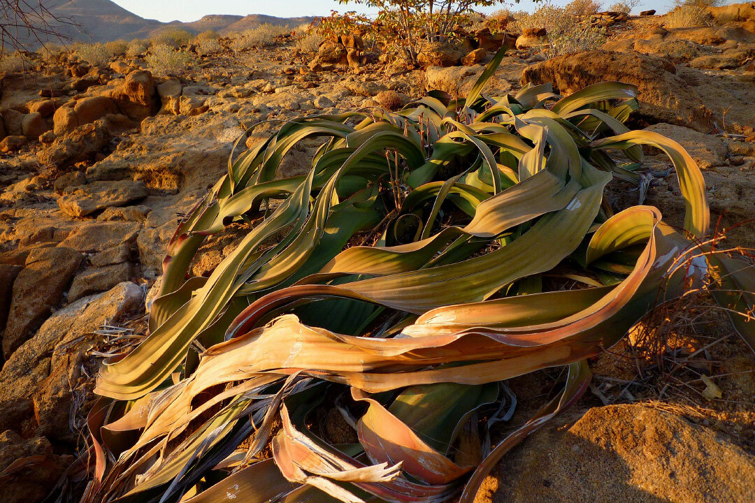 Как говорится, жить захочешь и не так раскорячишься. Выжить в знойной пустыне, да ещё и не просто выжить, а прожить больше тысячи лет и не потерять ни одного листа – задача под силу далеко не каждому растению. Да что там не каждому? Собственно, только одному и под силу. Итак знакомимся. Вельвичия удивительная. Из названия уже понятно, что растение удивляет. И как вы поняли в первую очередь своим возрастом, переживая дубов-долгожителей. И хоть вид вельвичия имеет такой, что кажется будто она вот-вот загнётся, на самом деле она живее всех живых. В заголовке я написал, что за всю жизнь, которая может продлиться больше тысячи лет, растение не теряет ни одного листа. И это правда, так как листьев у него всего два. Рождается оно с четырьмя листьями, он два из них превращаются в солнцезащитный кожух, прикрывая верхушку растения, а два других выполняют свою обычную функцию. Вы можете спросить: "Как же так? Ведь на фото кажется, что листьев много?" Именно кажется. На самом деле, листы постоян