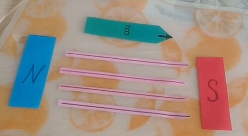 Покажем : как должна двигаться проводящая рамка в магнитном поле, чтобы возникал электрический ток в проводящей рамке. . Вырежем и картона рамку. Из бумаги вырежем фигуры, обозначающие северныйи южный полюса магнитного поля, силовые линии магнитного поля. Силовые линии - это образное представление невидимого магнитного поля. Они из северного полюса выходят, в южный входят. Или так направлен вектор магнитной индукции В магнитного поля.
