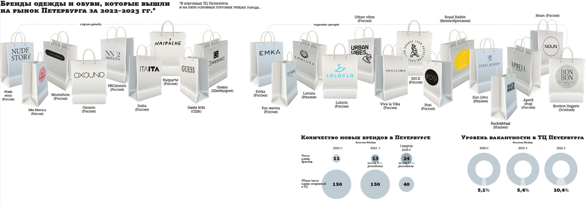 В ТРЦ "Галерея" начали работу торговые точки брендов одежды Anna Pekun (Петербург) и 2Mood (Подмосковье). На рынок Северной столицы также хлынули бренды из разных регионов страны. Например, в I квартале открылся магазин Noun из Волгограда. Компания заняла помещение в ТРК "Европолис", в котором раньше располагался магазин Monki шведской компании H&M Group. Полина Фиофилова отмечает, что бренды из регионов открывают магазины на Невском проспекте и Большом проспекте П. С. На последнем, в частности, открылся бренд Oxouno (Таганрог).