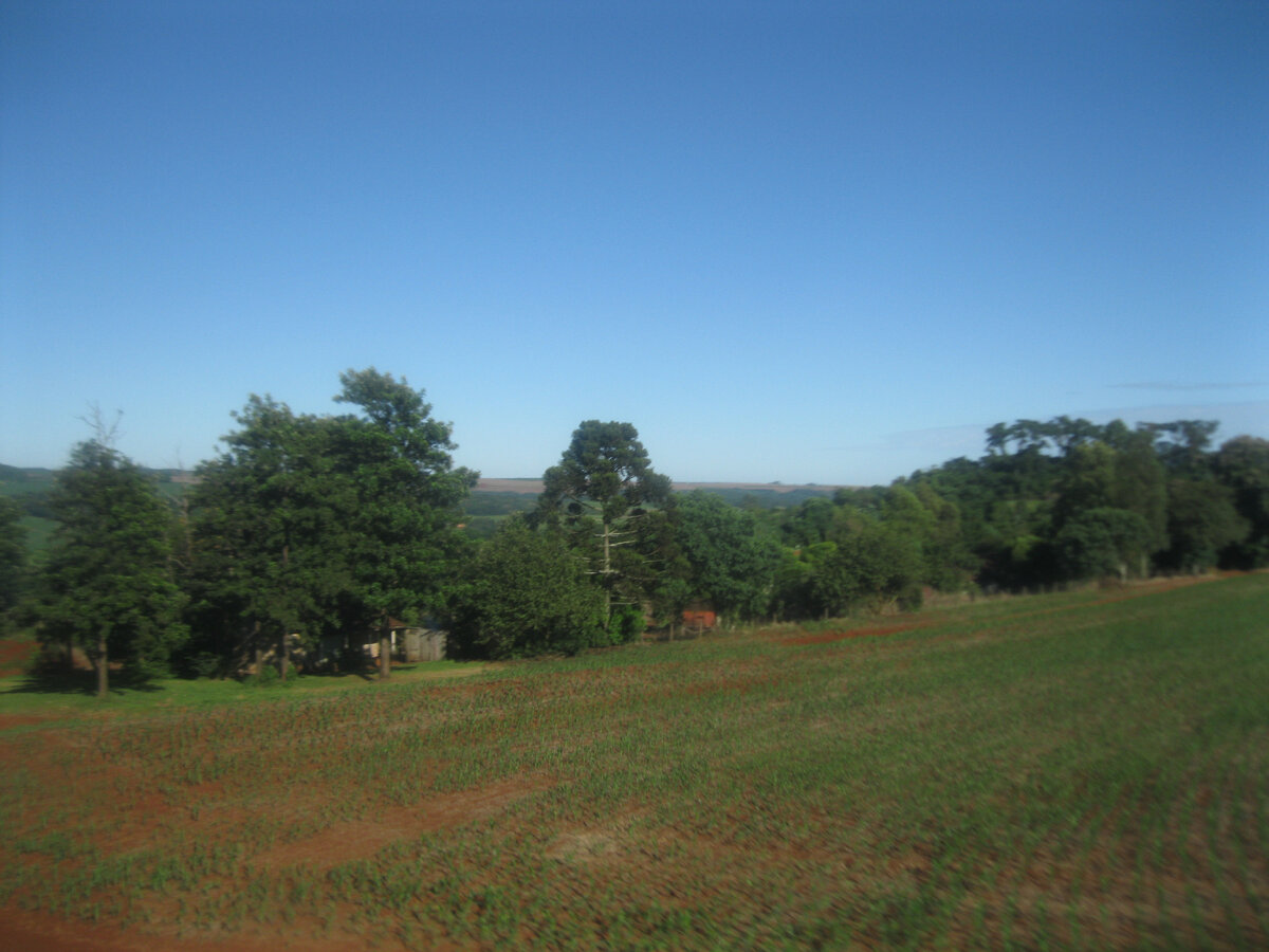На следующий день я окончательно проснулся, когда автобус плавно катил пассажиров по штату Парана, в западной части этого южно-бразильского штата на подъезде к городу Каскавель. Ранним утром я просыпался несколько раз, когда автобус останавливался у придорожных ресторанов, выходил попить кофе и перекусить, потом снова засыпал. Комфортабельность автобуса позволила мне прилично выспаться (спинка откидывалась почти горизонтально, едешь как в кровати). В Фос-ду-Игуасу автобус должен был прибыть в 9-00, но видимо из-за сложного трафика около Са-Паулу мы опоздали примерно на час. Утром я позавтракал на очередной остановке, поглазел на идиллический сельский пейзаж Параны. Коровы, овцы, поля, аккуратные маленькие селения, все прилично очень близко к Европе, по крайней мере к Чехии или Польше.