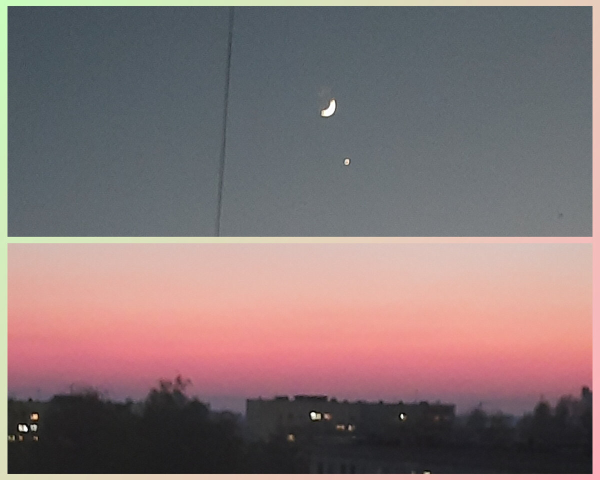 Это невероятное зрелище! На фото не получилось одновременно вместить всю палитру обалденного заката, молодой месяц и Венеру. Но мой глаз эту красоту зафиксировал. Венера по-сравнению с месяцем совсем маленькая точка, но когда она совершенно одна на фоне вечернего заката, то похожа на яркий жёлтый фонарик. Думаете, почему мы её вообще видим, это же планета и она "не горит"? А это потому, что солнечный свет отражает её плотные слои атмосферы. Весь апрель стоит отличная солнечная погода, и мы можем наблюдать планету по вечерам ещё до появления звёзд с западной стороны ещё примерно 4-5 месяцев. Венера символизирует красоту, изящество, а также богатство и обеспеченность. Под её покровительством происходят знакомства, романтические встречи, влюблённость, получение денег и даже монетизация своих талантов. Но это в общем. А в частности всё зависит от положения Венеры в вашем индивидуальном гороскопе. Чем она у вас в жизни управляет? Чем владеет? В чём проявляется? Желающим отвечу, какую