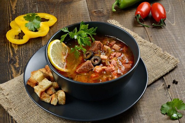 Продукты (на 8 порций) Колбаса вареная — 300 г Грудинка свиная копченая — 300 г Колбаса копченая — 250 г Картофель — 500 г (6-7 шт.) Огурцы соленые — 350 г (4-5 шт.) Оливки — 150 г Лук репчатый — 100 г. (1 шт.) Томатная паста — 2 ст. ложки Рассол огуречный — 150 мл Масло растительное — 4 ст. ложки Соль — 1 ч. ложка Перец чёрный молотый (смесь перцев молотых) — по вкусу Вода — 2,5 л* Для подачи:Петрушка свежая — по вкусу Лимон — 3-4 ломтика