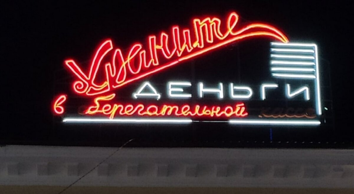 В 2022 году с помпой на крышу дома 59 на улице Ленина в Калуге вернули советскую вывеску Храните деньги в сберегательной кассе. Но любовались ею калужане недолго. — Проходя по улице Ленина, обратила внимание, что восстановленная вывеска приобрела весьма загадочный вид. Теперь вот ломаю голову, что это за заведение под названием «берегательная», и где оно находится, — удивляется Ольга Серова. Фото группа «Калуга и калужане» «ВКонтакте». Елена Французова
