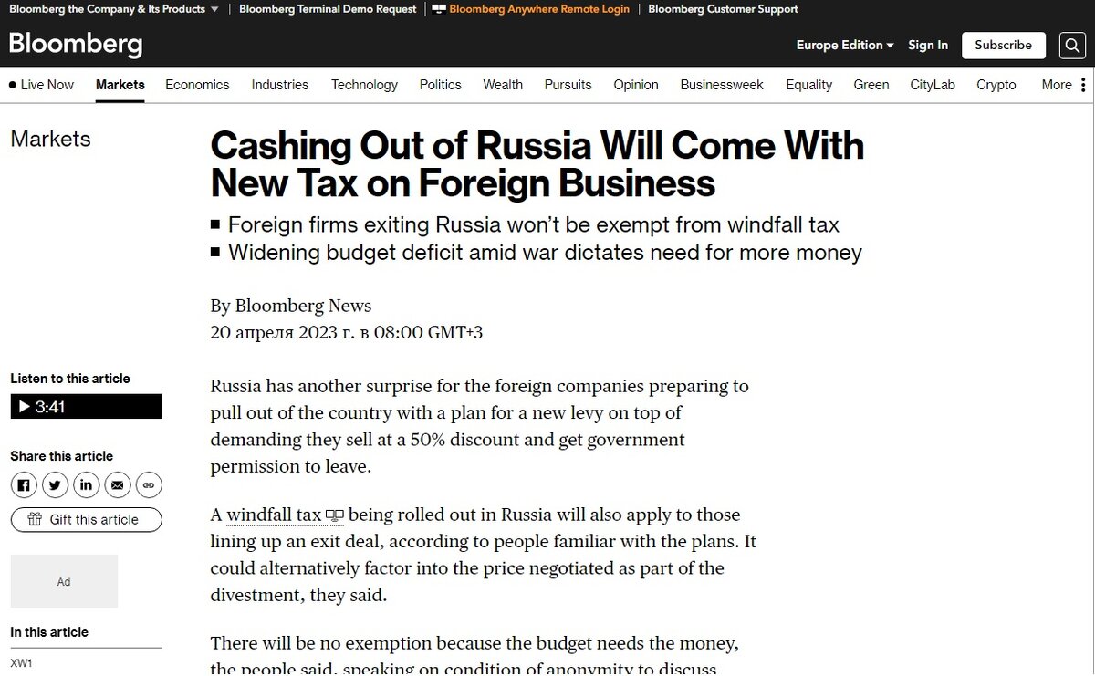 Все, уходящие с российского рынка, компании, помимо скидки в 50% на активы, должны будут заплатить налог. Казна пополнится на 300 млрд