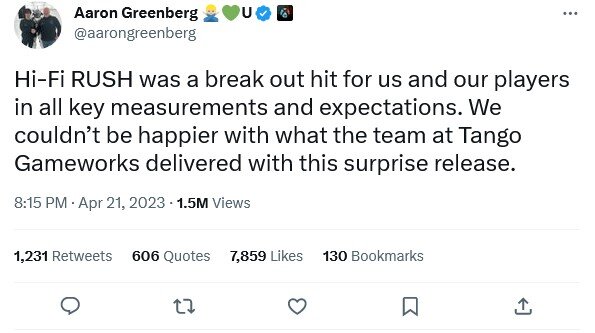 На прошлой неделе Джефф Грабб дал комментарий о том, что Hi-Fi Rush от Tango Gameworks оказалась провалом для Microsoft. Якобы, игра не оправдала финансовых ожиданий Microsoft. Похоже, это не так. Вице-президент маркетинга Аарон Гринберг прокомментировал слух в Твиттере и сообщил, что игра оказалась успехом по всем фронтам. Hi-Fi Rush стала настоящим хитом для нас и наших игроков по всем ключевым показателям и ожиданиям. Мы не могли бы быть более счастливыми с тем, как команда Tango Gameworks сделала этот удивительный релиз. Грабб позже дал комментарий о том, что он не знает метрик Microsoft, поэтому сложно оценивать успех игры. Его данные основывались на выручке игры. Джефф Грабб: Hi-Fi Rush не оправдала финансовых ожиданий, руководство Microsoft недовольно положением Xbox Hi-Fi Rush доступна на PC и консолях Xbox. Steamspy указывает, что продажи игры находятся между 200 и 500 тысячами копий. Комментарии на сайте