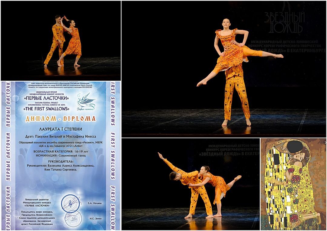 Все то, что иногда кажется сложным:добиться от исполнителей в младшем возрасте- воздается в них, во-взрослении! Исполнители данного дуэта выросли в нашем любимом «Респекте». В периоде, когда идет понимание того , о чем они танцуют и как передают образ идеи постановщика . То, как они воплощают задуманное! Особенно важно, когда это - дуэтная работа! Мы всегда восхищались работой наших детей в дуэте! Это и тактика, и совместный ритм и адекватное понимание общей работы. Приятно, что на протяжении нескольких лет, дуэт «Грезы. Климт» на всех ротациях конкурсов хореографии, знатоки оценивают на высший балл и делают «комплименты» исполнителям и концепции номера. Задумка данного номера всегда оставляет шлейф загадки и тем не менее дает конкретную отгадку: «Поцелуй» Густав Климт. Данная работа мастера написана им в 1908 -1909 годах. На фоне его картины и создан наш дуэт : Виталий Пакулин, Инесса Мустафина… Красота, грация - все те линии , которые так любят хореографы! Очень обволакивающие стру