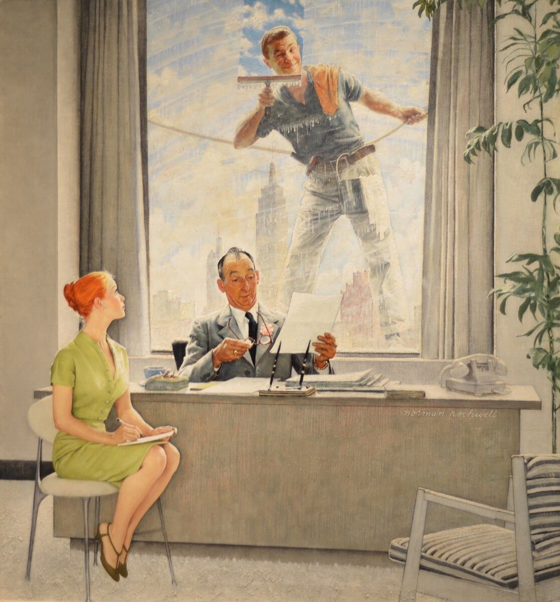Даже унылое офисное утро может заиграть новыми красками, если приправить его доброй улыбкой. Подтверждением тому служит картина Нормана Роквелла «Мойщик окон». Действие происходит на одном из последних этажей небоскрёба. За большим столом важный господин, видимо руководитель крупной организации, просматривает бумаги. На стуле напротив замерла молоденькая грациозная секретарша. В ожидании указаний она случайно бросила взгляд в окно за спиной шефа, и её деловой настрой мгновенно улетучился. За оконным стеклом верхолаз с ведром и мыльной щёткой. К поясу рабочего прикреплены страховочные тросы. Высота нисколько не пугает парня. Весь его внешний вид излучает уверенность и превосходное настроение. Мытьё он начал на уровне своего лица и в образовавшееся «окошечко» тут же заметил очаровательную рыжеволосую красотку. Реакция юноши мгновенна: он широко улыбается и подмигивает прелестной незнакомке. Теперь мысли девушки весь день будут крутиться вокруг неожиданной встречи. Кажется,