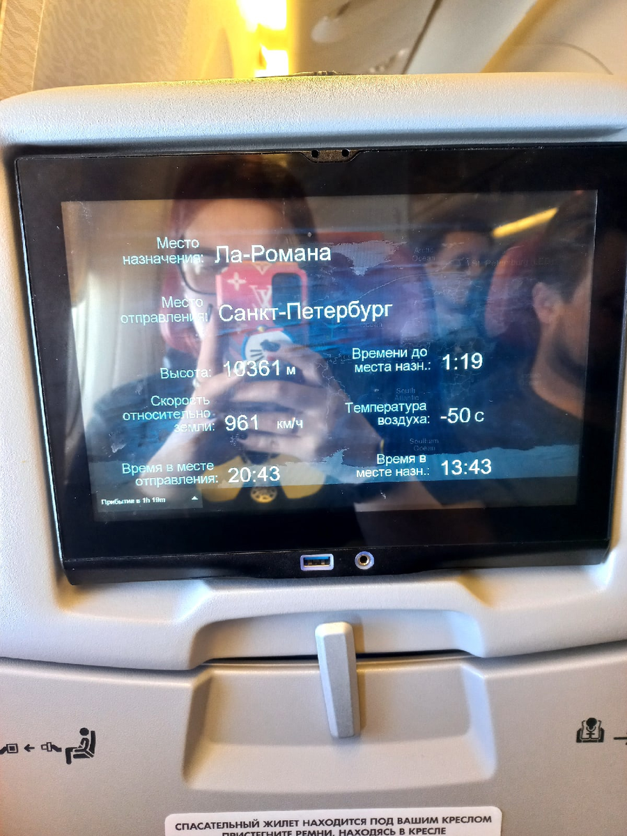 Никогда не любила жару. Но всегда любила путешествия. Поэтому, когда муж предложил слетать куда-нибудь, погреться, я долго (очень долго!) думала. С одной стороны, хотелось. А кому ж не хочется в феврале погреть попу на пляже? А с другой стороны, вспоминая единственный южный отпуск в Абхазии, сразу становилось жарко и муторно. Но путевки были куплены и отправились мы в Доминикану. Летим в Доминикану! Дорога "туда" заняла 10 часов. А я летать боюсь. Чуть не стала "частью команды, частью корабля", как Билл-Прихлоп, потому как слишком мощно держалась за поручни кресла в зонах турбулентности. КОрмили 2 раза, кресла не сказать, что сильно удобные, но небольшое количество фильмов, закачанных на этот прекрасный "экранчик" во впередистоящем кресле помогли скоротать время. Прилетели в Доминикану! Честно, выйдя из самолёта, я опешила от того, насколько мокрый там воздух! Казалось бы, в Питере влажность воздуха такая, что впору жабры отращивать, но оказалось, что даже нам в Доминикашке трудно дыша