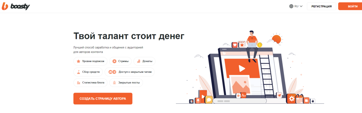 За окном весна, на улицы выходят садовники. Но не в южном полушарии! Да, в жизни бывает и так, когда в другом полушарии осень, а ты сидишь на весенней травке. Так вышло и с нашим предметом сегодняшнего расследования. Запущенный российскими людьми в 2019 году, он получил известность в прошлом году: молодые блогеры разного возраста, от мала до велика, приходили на площадку, но удержаться за её ноги удалось не всем. Зовут наш предмет - Boosty, в простонародии "повышение квалификации". Давайте же разбираться в этом чуде отечественных разработчиков. Глава один - Главная страница. Зайдя на сайт, я чуть не ослеп от изобилия белого цвета. Справа от центра мы видим доску, на которой сидит человек в оранжевой футболке. (Примечание: уже до этого я понял, что авторы сайта имеют связь с Голландией, уж больно им по душе приходится оранжевый цвет). Большой надписью нам говорят, что мой талант стоит денег, но я так не думаю, ибо мне и вас хватает, дорогие подписчики. Нам хотят всеми силами доказать