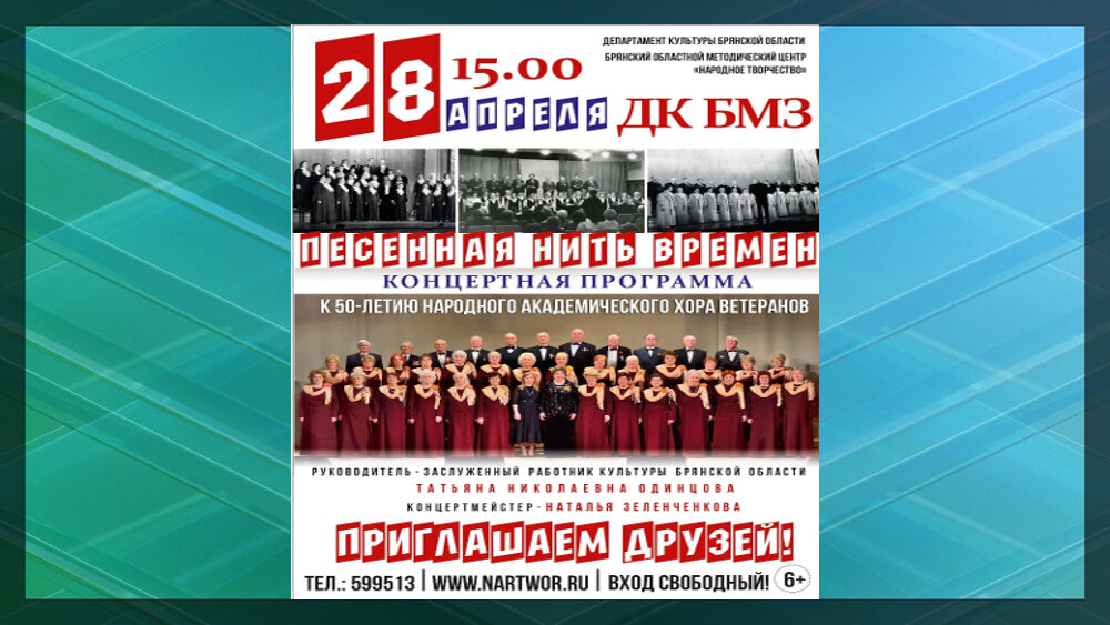 Народный академический хор ветеранов Дворца культуры БМЗ, а теперь Центра «Народное творчество», в этом году отмечает свой 50-летний юбилей. Он был создан в Бежице еще до Великой Отечественной войны. Его новейшая история началась в 1973 году, когда он был возрожден по инициативе любителя хорового пения Владимира Сёмова. С 1979 года и по сегодняшний день им руководит заслуженный работник культуры Брянской области Татьяна Николаевна Одинцова. В 1985 году хор удостоен звания «Народный». Истрию коллектива попробуют проследить его участники в сценарии праздничного концерта «Песенная нить времен», который брянцы увидят 28 апреля в 15:00 во Дворце культуры БМЗ Брянского областного методического центра «Народное творчество». В программе прозвучат произведения советских и российских авторов, песни военных лет, романсы и русские народные песни — все самое лучшее за годы творческой деятельности Народного академического хора ветеранов. Кроме того, с сольными номерами выступят Виктор Фурманов, Викт