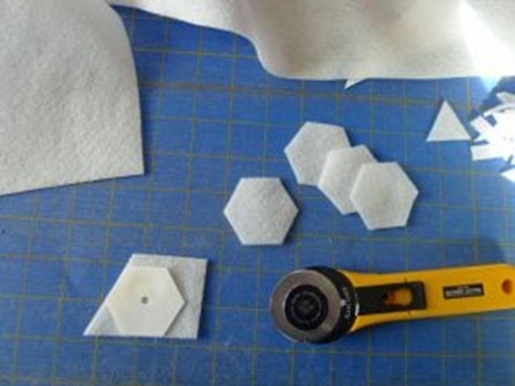 Правильные шестиугольники или гексагоны - очень красивая и гармоничная фигура не только в пэчворке. Несмотря на то, что из гексагонов делают множество разных проектов, шить их временами весьма утомительно. Тем более, что шьют их вручную. Значительно легче сшить такие гексагоны с помощью плавкого флиса, при этом сразу убирается несколько этапов из процесса шитья гексагонов Для начала вырезается правильный шестиугольник из этого плавкого флиса (у нас он тоже продается, но надо приложить усилия, для того, чтобы его найти). Сначала вырезаем такие шестиугольники из плавкого флиса (в отличие от обычного плавкий флис - это вид мягкой подкладки. Такую подкладку можно гладить, чтобы изделия не теряли свою форму): Далее вырезаем шестиугольники из основной ткани, они должны быть на 8 - 10 см больше, чем шестиугольники из флиса: На ткань с левой стороны накладываем гексагон из флиса и приглаживаем припуск не задевая флис: Последовательность приглаживания припусков можно посмотреть на фото ниже: П
