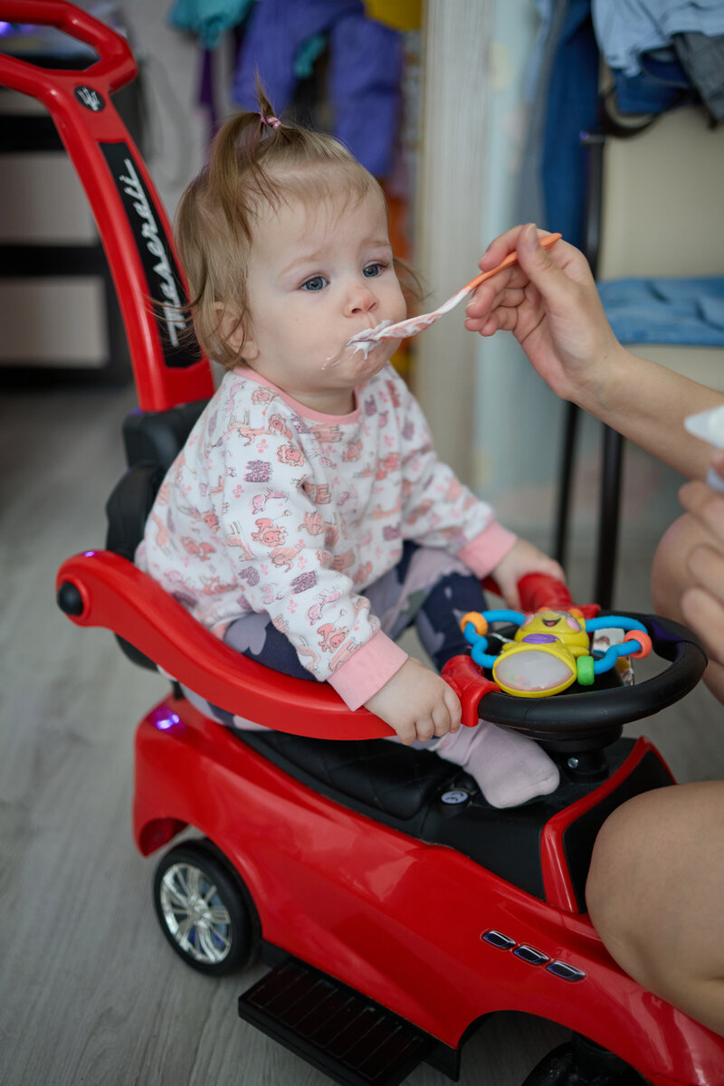 Добрый день☀️ Вот уже и понедельник пролетел... Утро этого дня началось у меня немного пораньше в 07:00, Агата как всегда покричала и успокоилась только на груди. Пока укладывала её, услышала что мои то уже не спят и отправилась нянчить их и кормить. В 8:30 проснулась Агата. Поела кашу, и в это время играла крышкой из под крема и гигиенической помадой. Развивала мелкую моторику и заодно открывала рот для очередной порции каши. С утра решила сделать одно важное дело- стрижка ногтей. Это прямо большая проблема у нас, даже мультфильмы не помогают. Знаю, что многие занимаются этим во время сна ребёнка, но Агата очень чутко спит и поэтому это не наш вариант. Взяв свои нервы в кулак я включила на телефоне потешки и приступила к нашей "экзекуции". На удивление в этот раз она не вырывала свои пальчики и в целом занятие прошло довольно безболезненно для нас двоих. Покормила всех творогом. Агата отказывалась слезать с машины, пришлось её кормить вот так. В 11:20 всех выпроводила за борт, а я ос
