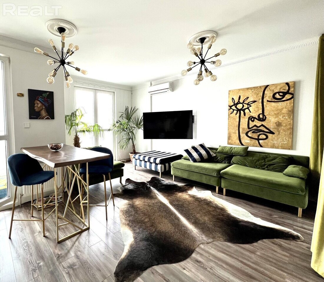 Климат Беларуси не позволяет радоваться зеленью и солнцем круглый год. Особенно в пасмурные дни хочется телепортироваться куда-нибудь в теплые края. Владельцы квартиры в ЖК "Маяк Минска" решили эту проблему, сделав яркий интерьер с тематикой африканского мира. Нет, лиан и живых мартышек там нет, но животных, птиц и зеленого цвета хватает. Кстати, комнатные растения останутся покупателю (кажется, такого подарка еще не было). Сколько же стоят эти городские джунгли? На Туровского, 16 в доме ЖК "Маяк Минска" на 13 этаже продается квартира площадью 45,3 м². Дом был построен в 2016 году в 16 этажей. В квартире сделаны прихожая с гардеробной, санузел, кухня-гостиная и зона спальни. Интерьер выполнен в природных оттенках. Яркой и светлой квартира становится благодаря цветам стен и естественному свету, что поступает через панорамные окна. Диван и текстиль отлично выделяются на фоне и создают летнюю атмосферу. Ее же подчеркивают растения. Изюминку в интерьер приносят кованные предметы, необычные