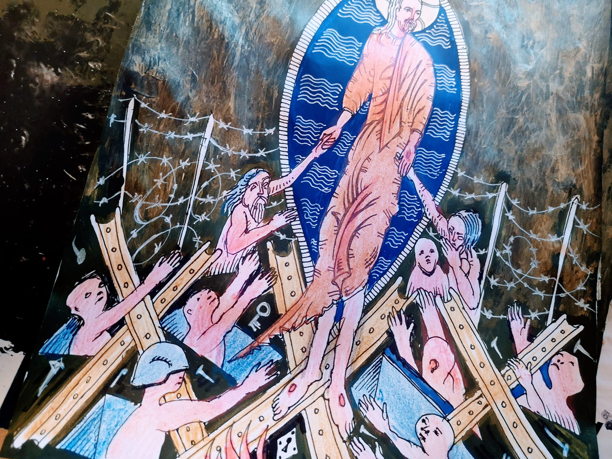 Черный фоновый цвет очень редко используется в иконах, потому что он олицетворяет Адскую бездну. Сошествие! С другой стороны, именно на черном фоне очень хорошо смотрятся ключи, механизмы, белые гвозди, и детали разбитого замка, и всякий другой стальной мусор.
