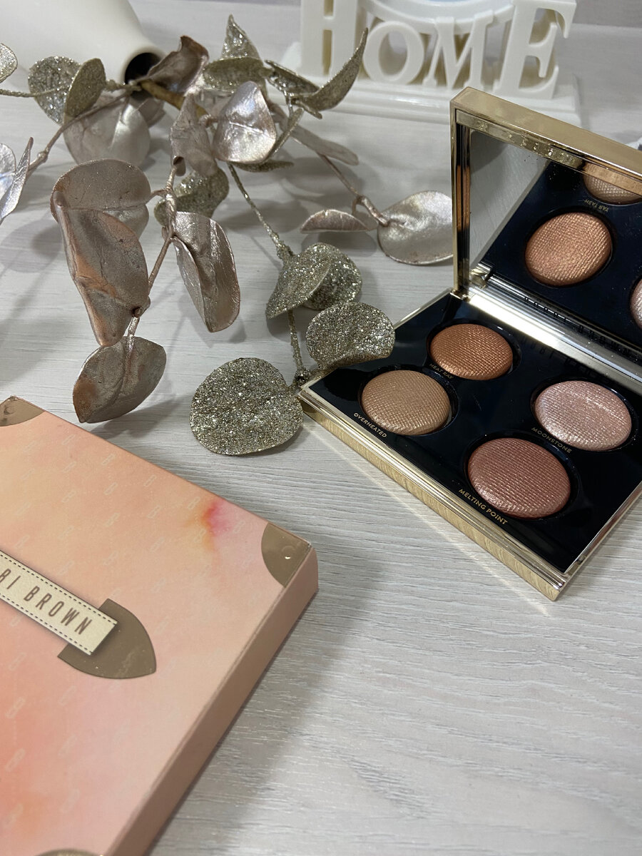 Я так хотела одну из знаменитых четверок Bobbi Brown!И вот она у меня. Чего стоит только одно оформление!На белой коже выбито золотом название Бренда.Смотрится стильно.Люкс.10 грамм теней.Получается на рефил по 2,5 грамма.Сама палетка теплая. ✨Тут есть и знаменитый Спаркл Moonstone.Красивый и сияющий .Украшение любого макияжа. ✨Heat Rey уже менее сияющий ,но так же красиво переливается на глазах. ✨Нижний ряд :Overhead (желтый) и Melting Point (персик )запечённые тени ,атласные,особо без переливов. Я оооочень довольна данной палеткой.Она идеально подходит и как палетка-украшалочка и как самостоятельная на лето! #bobbibrown #bobbibrownrussia #bobbibrownluxeeyeshadow