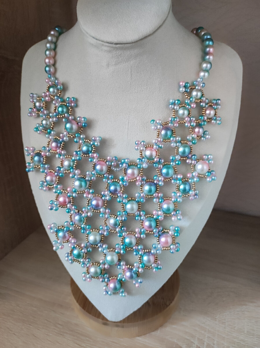 Кружевница. Колье уголок, выполнено из искусственного жемчуга 8 и 4 мм,чешского бисера. Плетение на леске. Фурнитура состаренное золото. Колье 50 см, уголок 10,5 см Хорошо лежит на груди. Цена 1850 руб.+доставка.