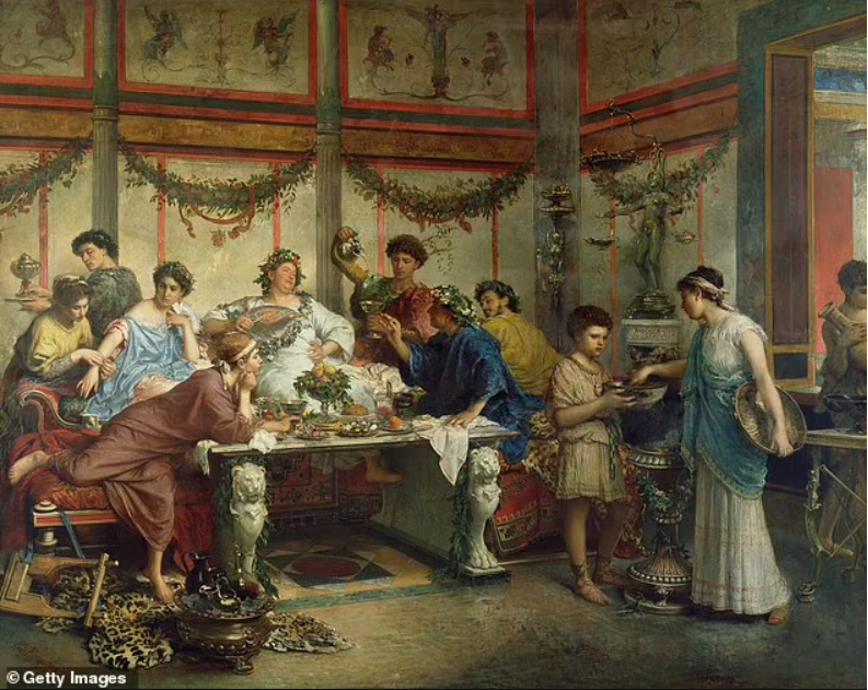 - Классические римские трапезы принимали на кушетках вокруг императора. Блюда начинались с хлеба и вина, что-то с яйцами, потом огурцы, спаржа, кефаль, сладкая морковь, фаршированные кабачки. Иногда были и более изысканные блюда, например, соловьи, намазанные медом Апиция, фаршированные черносливом, украшенные лепестками роз, подаваемые в соусе из трав и виноградного сока.