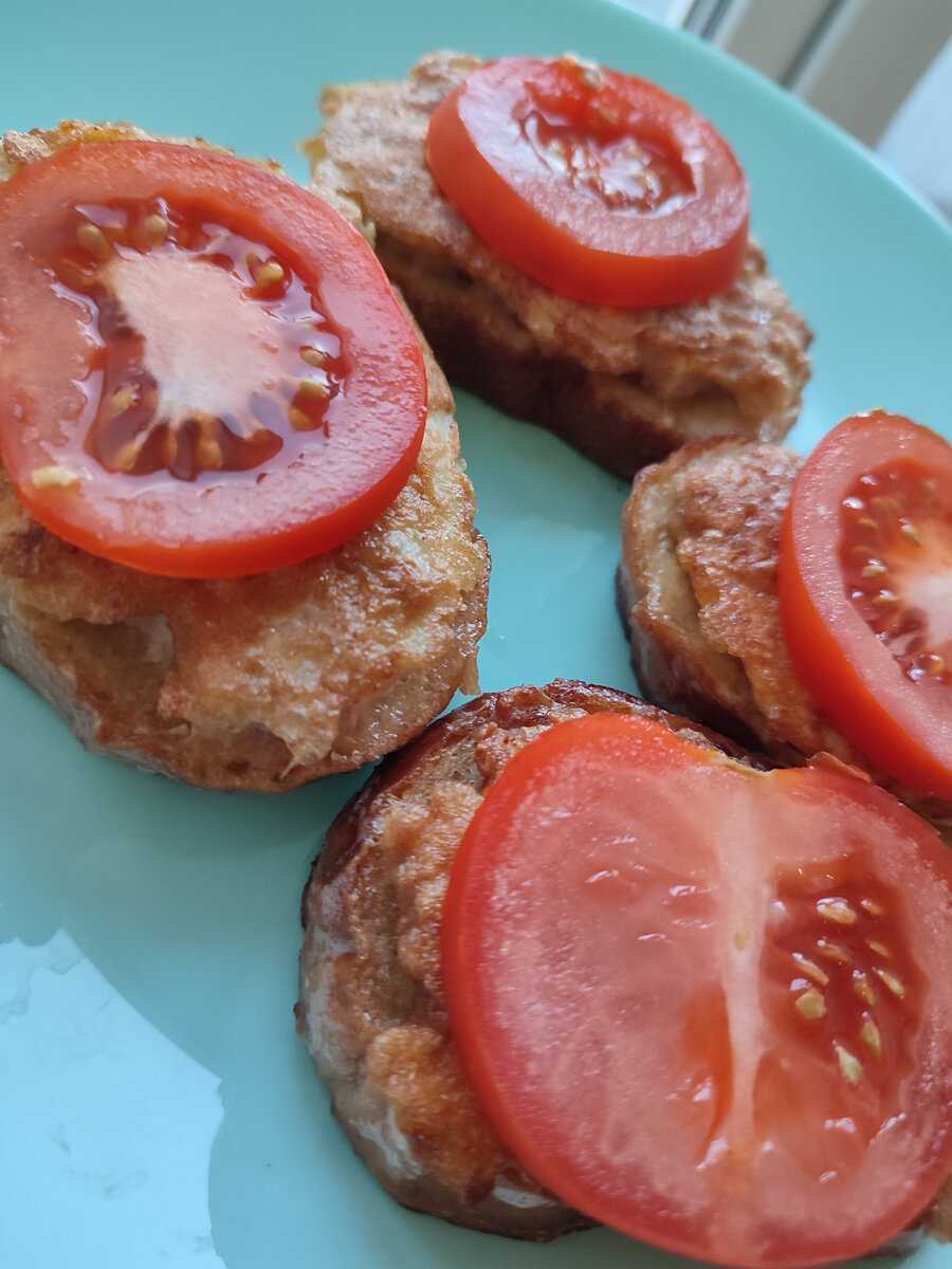 Это рецепт из серии "быстро, дёшево и легко". Я обычно делаю тогда, когда остаётся фарш от другого блюда. Нарезаем батон, готовим яичную смесь. У меня просто взбитые с солью яйца. На батон ложкой выкладываем свежий фарш. У меня в этот раз остался от фрикаделек. Был с луком. Фарш хорошенько приминаем к батону. Полученные бутерброды окунаемся в яйце и жарим как обычные гренки. Я делаю средний огонь, чтоб фарш успел прожариться. Получается быстро, вкусно и сытно. Мне нравится с помидоркой или огурчиком сверху, но можно и без всего.
