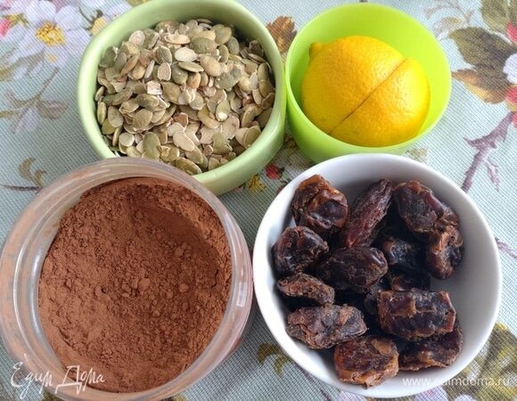 лимонный сок - 1ст. л. Шаг: 1 Финики промыть, обсушить, вынуть косточки, если есть. Шаг: 2 Тыквенные семечки заранее обжариваю всю пачку и так храню в коробке с плотной крышкой. Шаг: 3 Измельчить семечки, необязательно в муку, а оставить крупкой. Шаг: 4 Нарезать к семечкам финики. Смолоть пару минут вместе. Шаг: 5 Выжать лимонный сок для связки и баланса сладости. Шаг: 6 Скатать шарики размером с грецкий орех. Шаг: 7 Обвалять в какао. Шаг: 8 Конфеты готовы к подаче. Шаг: 9 Можно и взрослым и детям. Шаг: 10 После чаепития хранила в холодильнике.