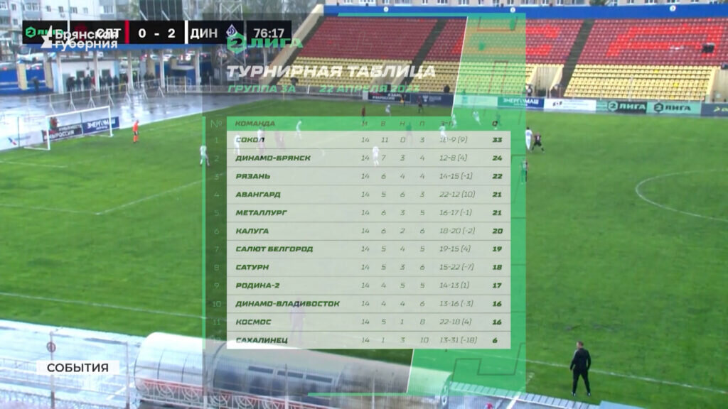 Брянские динамовцы продолжают погоню за лидером турнирной таблицы, саратовским «Соколом». Очень важные три очка сине-белые заработали в минувшие выходные в Белгороде. В четвертом туре чемпионата Второй лиги брянское «Динамо» на выезде встречалось с белгородским «Салютом». Уже на второй минуте капитан «Салюта» Денис Белобаев спас свою команду, выбив мяч из пустых ворот после удара динамовца Кирилла Гордеева. На пятой минуте всё тот же Гордеев проходит по правому флангу, простреливает — рикошет, и Дмитрий Пикатов открывает счёт в поединке — 0:1. На второй минуте второго тайма он же оформляет победный дубль. По итогам четвертого тура в турнирной таблице брянское «Динамо» отстает от лидера на девять очков. Погоня продолжается. Следующий матч команда Александра Фомичева проведет 29 апреля. На родном поле сине-белые встретятся с клубом «Космос» из Долгопрудного. Этот поединок зрители «Брянской Губернии» уже по традиции смогут посмотреть в прямом эфире. 0+ ФК «Динамо-Брянск» со счетом 2:0 обы