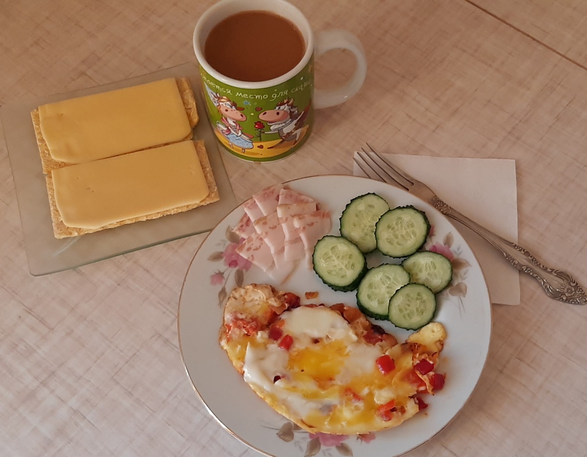 Утро началось с хорошей новости. Весы показали 66,8 кг. Отвес за сутки составил 1,1 кг. Вот что значит грамотно составленное трехразовое питание без перекусов. Чем питалась сегодня? Завтрак. Яйцо с помидором, луком и красным болгарским перцем. Свежий огурчик, сало. Кофе без сахара с молоком и двумя безглютеновыми хлебцами с сыром. Обед. Гречка - наше все! Добавила к ней запеченое куриное филе бедра. Салат: помидоры, огурцы, сметана. Чай без сахара. Ужин. День был физически тяжелый. Организм попросил ужин поплотнее. К остаткам вчерашнего киноа с овощами добавила кусочек курицы. К несладкому кофе с молоком - творожный сырок с цукатами. Сырок, конечно, не уместен для ужина, но посмотрим, что на это завтра ответят весы.😉