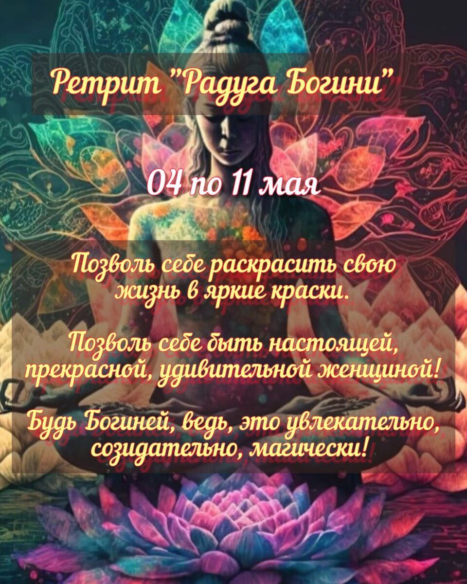 Ретрит "Радуга Богини" направлен на раскрытие глубинной памяти женщины и запуск процесса трансформации в каждой из участниц.