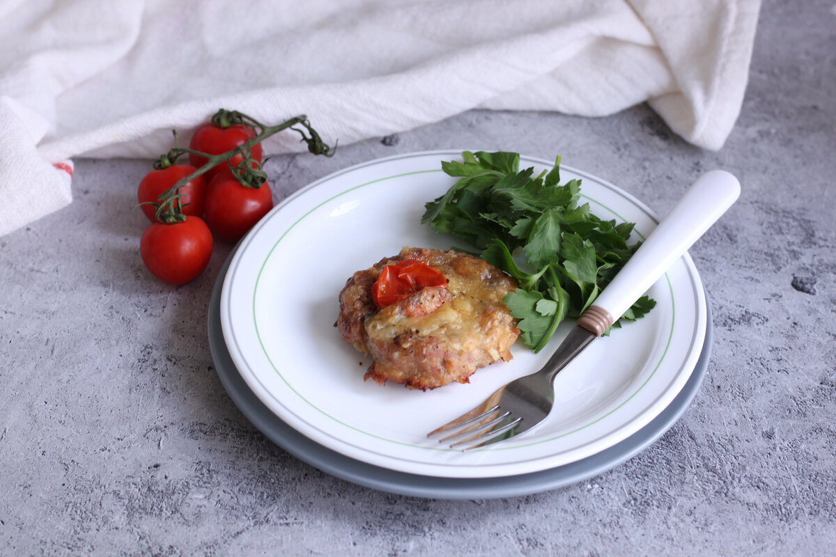 Если надоели привычные котлеты, предлагаю приготовить это простое, но оригинальное блюдо. В фарш добавить специи и приправы, хорош вымесить. Разделить фарш на 5 частей, сформировать шарики, обвалять в муке и слепить круглые котлеты, сделав в центре углубление для начинки. Смазать поверхность растительным маслом. Гнезда выложить на противень с пекарской бумагой или ковриком для выпечки. Чеснок измельчить. Помидоры, если крупноватые, то разрезать пополам, если маленькие, то можно взять целые. В каждое углубление выложить немного чеснока, сверху помидор и 2 шарика моцареллы. Запекать в духовке 40 мин при 180.