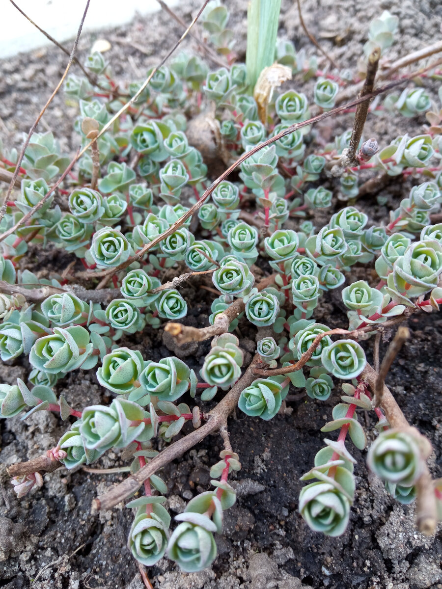 В предыдущей статье я рассказала о первоцветах, которые цветут в конце апреля. А теперь хочу показать, как сейчас выглядят некоторые растения, которые зацветут позже. Узнали? Эти крохотные голубоватые "розы" - верхушки побегов очитка Эверса. А вот этот "букет зелёных роз" - плотная подушка очитка обыкновенного. Такая картина у многих в саду имеется. Но в весенних хлопотах мы проходим мимо, не вглядываясь в такую совершенную красоту. А это ярко-зелёные блестящие листья фиалки душистой. Она новичок в саду, жду её премьерного цветения. Крупные пильчатые листья бузульника зубчатого привлекают внимание своей антоциановой окраской. Ему и цвести не обязательно, он и так хорош. Барбарис Тунберга Атропурпуреа Нана только собирается надевать свои богатые одежды. А вот зелёно-белый подъюбочник уже надел (из анемоны дубравной). Активно готовит свои бутоны к цветению иберис. Совсем скоро появятся его белые мелкие цветочки. А вот росший рядом его родной брат зиму почему-то не пережил. Как тако